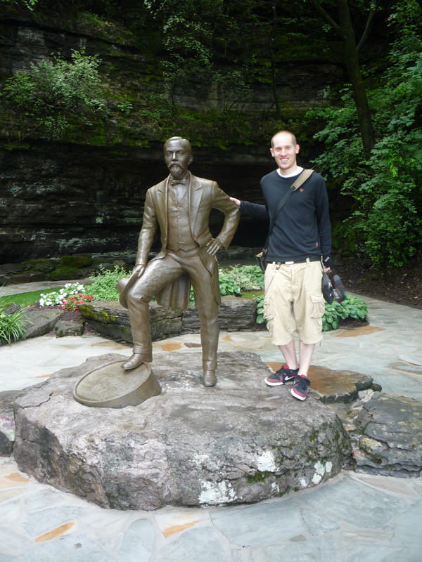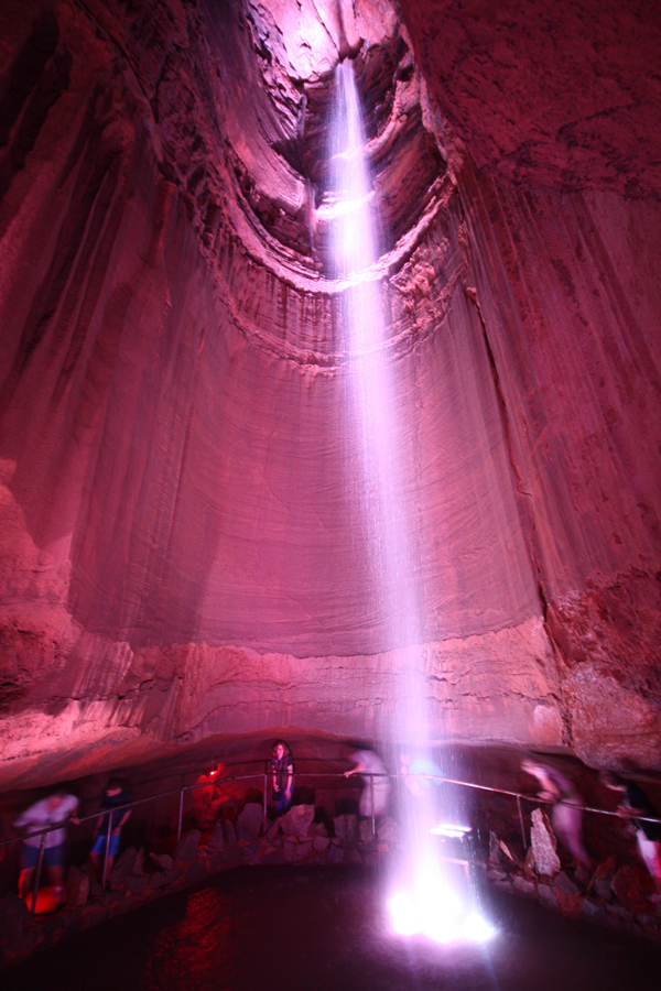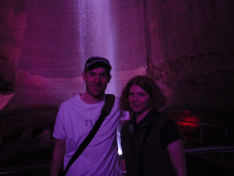 Heute haben wir wirklich viel erlebt. Unser erster Weg führt uns zu den Ruby Falls, dem größten für die Öffentlichkeit zugänglichen, unterirdischen Wasserfall in den USA (eigentlich fast eine Schande, wenn man bedenkt, dass wir es bis jetzt noch nicht mal in die Lurgrotte geschafft haben). Angekommen am Lookout Mountain, fährt man mit dem Lift ganz bequem 260 Feet (müssen wir noch in m umrechnen - oder wir machen einfach eine neue Frage des Tages draus und ihr müsst umrechnen - gute Idee!) in das Höhlensystem runter. Dort quetscht man sich teilweise durch die einzelnen Tunnel (wir (noch) eher weniger, als einige unserer Gruppenmitglieder), die mitunter witzige Namen haben, wie die "Weight Watchers Lane". Nach ca. einer halben Meile Fußmarsch erreichen wir den unterirdischen Wasserfall (wir rätseln noch immer, warum es Ruby Falls heißt) und wie durch ein Wunder, schaltet der Tourguide die "Wasserfall-Beleuchtung" ein und wir können nun auch sehen, was wir bis jetzt nur gehört haben. Recht clever die Idee, denn als das Licht plötzlich und ganz zufällig (!) ausgeht, ist der Spaß vorbei und wir gehen wieder zurück. Hier noch ein paar Schnappschüsse, bevor der Strom abgedreht wurde.