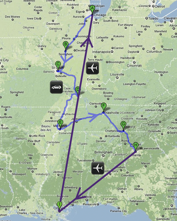 Unsere Reise startet in Chicago. Von dort fahren wir mit dem Mietauto auf der Route 66 über Springfield nach St Louis. Wir folgen der Big River Road entlang des Mississippi nach Süden bis nach Memphis Tennessee um uns auf die Suche nach Elvis zu machen. Dort folgt ein Schwenk in Richtung Osten. Wir fahren über Nashville und Chattanooga (eventuell ist auch ein Besuch des Great Smokey Mountains NP geplant) weiter bis nach Atlanta in Georgia. Da wir unbedingt "The Big Easy" einen Besuch abstatten wollen, fliegen wir über New Orleans zurück nach Chicago, wo die Reise endet.