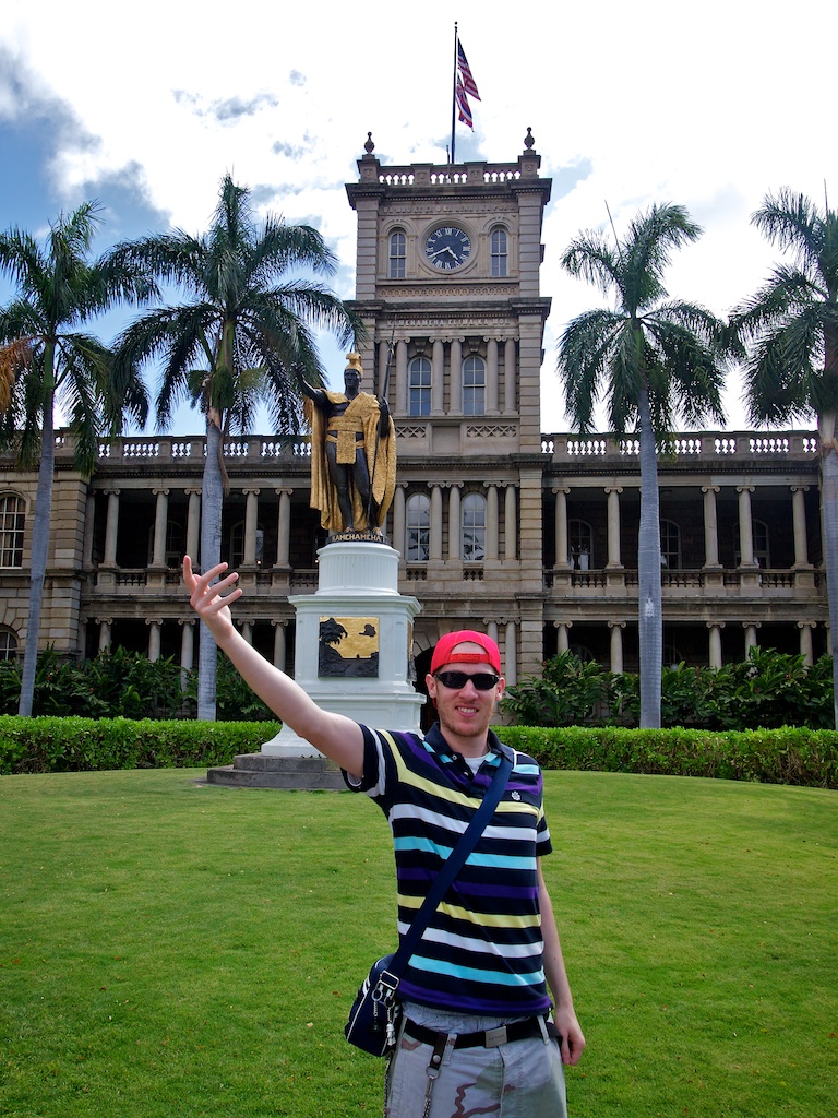 Am Nachmittag starten wir eine Erkundungstour durch die Altstadt von Honolulu und besuchen das Capitol, den Iolani Palce (die ehemalige königliche Residenz) und die King Kamehameha Statue (errichtet zu Ehren des ersten Königs von Hawaii). Da das ganze Herumgelaufe müde macht schauen wir am Nachittag “Man in Black 3″ an (recht empfehlenswert) und gönnen uns einen Mai-Tai in der Mai-Tai Bar. Dort bekommt Claudia auch ihr heiß ersehntes Mahi-Mahi (Goldmarkelen) Sandwich, anscheinend eine Art Spezialität in Hawaii.