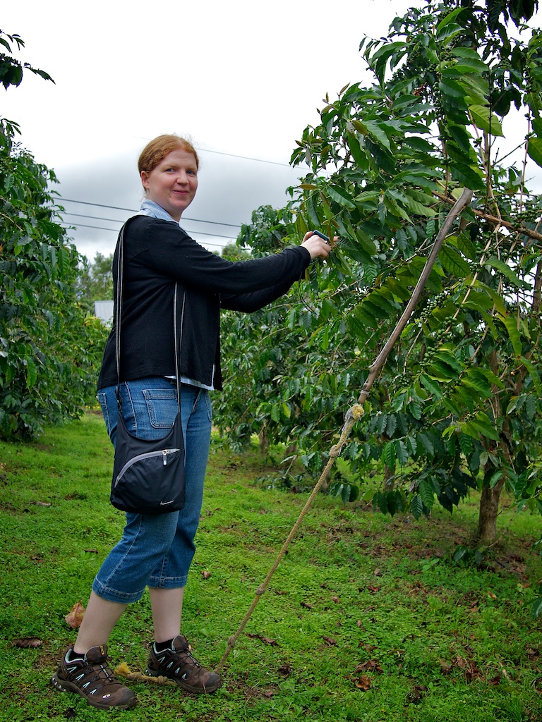 Zurück geht es nach Kona. Auf der einstündigen Fahrt sind wir bzw. eigentlich eher da Chris damit beschäftigt keine wild herumlaufenden Ziegen abzumurxen von denen es wirklich viele gibt. Nächster Stop ist die “Hula Daddy Kona Coffee Plantation”, ein wirklich unscheinbarer Ort (merkwürdig, dass unser Navi ausnahmsweise hierher gefunden hat). Nach der größten Ranch, für uns anscheinend die kleinste Kaffeeplantage inkl. kleiner Rösterei. Wie wir erfahren, werden in einem Röstvorgang gerade mal 4 kg Kaffee geröstet. Nun ist alles klar, wieso der Kona-Kaffee einer der teuersten auf der Welt ist. Die “Plantage” ist voll supa. Die Leute sind auch hier von Herzen freundlich, wir können den Kaffee verkosten und bekommen eine Privatissimum-Führung. Der Kaffee wird per Hand geerntet und sortiert. Es werden keine Pestizide eingesetzt und die “boring bugs” (die heißen wirklich so, aber nur deswegen, weil sie sich in die Früchte bohren) werden lediglich mit Alkoholfallen unschädlich gemacht. Hier gefällt’s uns!