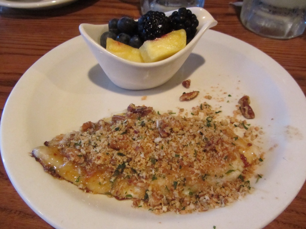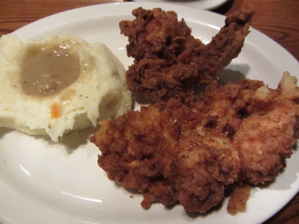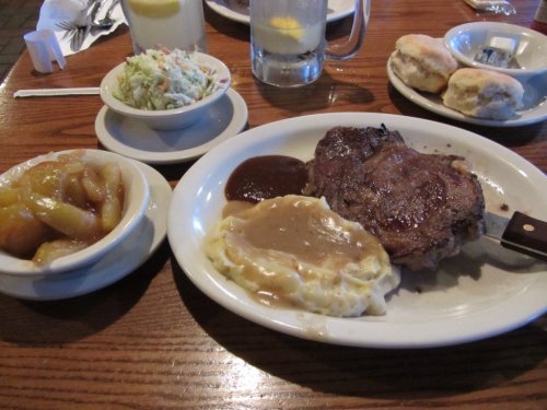 Und weil es so gut war, hier noch unser Abendessen im Cracker Barrel. Steak inkl. mashed potatoes und gravy, fried apples, cole slaw und biscuits für den Chris und Catfish mit Pekankruste und Obst (ich hab ja noch einiges vom Mittagessen wieder gut zu machen) für mich.