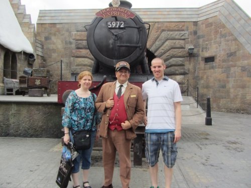 Als nächstes drehen wir eine Runde mit Harry Potter and the Forbidden Journey. Ein absolutes Must für alle Fans. Wir machen Hogsmeade weiter unsicher und nützen die Gelegenheit mit dem Zugführer vom Hogwarts Express ein Foto zu machen.