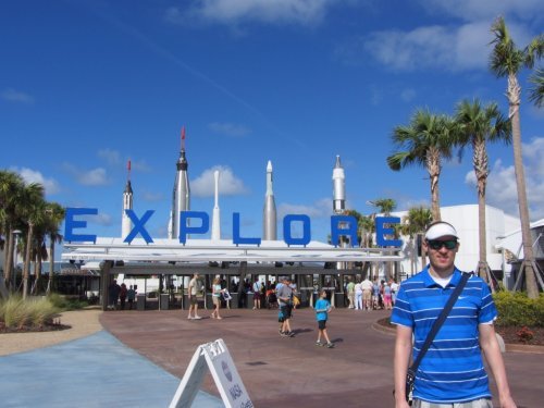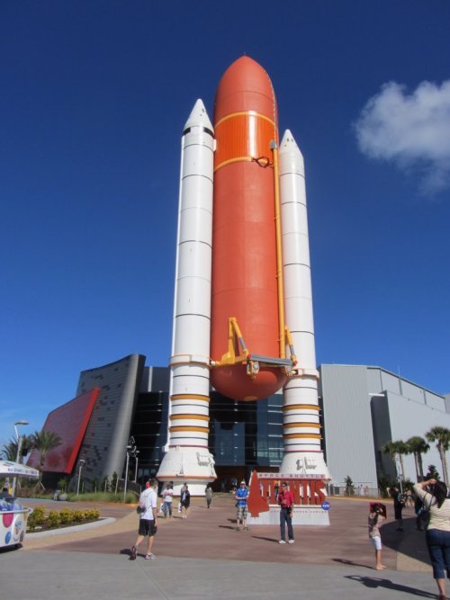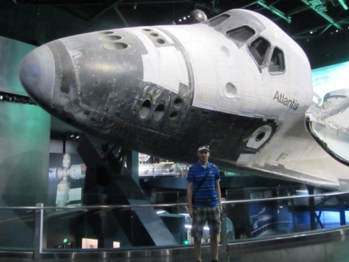 Zurück von der spannenden Tour sehen wir uns im Hauptcenter das Space Shuttle Atlantis an. Da Chris ist vor dem Eingang zum imposanten Gebäudekomplex, das ein richtiges Space Shuttle, die Atlantis (außer Dienst) beherbergt, “in blau” zu erkennen.