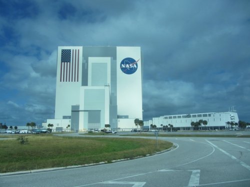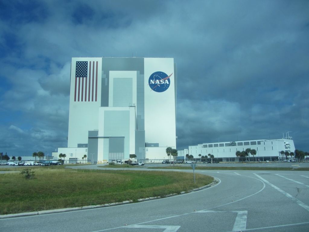 Wir starten unsere Tour mit einer Busrundfahrt über das Areal und sehen dabei das Vehicle Assembly Building, von dem aus die Raketen zu den Abschussrampen befördert werden.