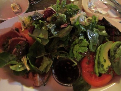 Hier mal ein Essen, das ich zur Abwechslung gerne herzeige. Salat mit Ahi-Thunfisch. Nach weltbestem Hotdog, weltbestem Backhenderl hier der bisher weltbeste Salat. Das wird echt schwierig, wenn wir wieder zu Hause sind…