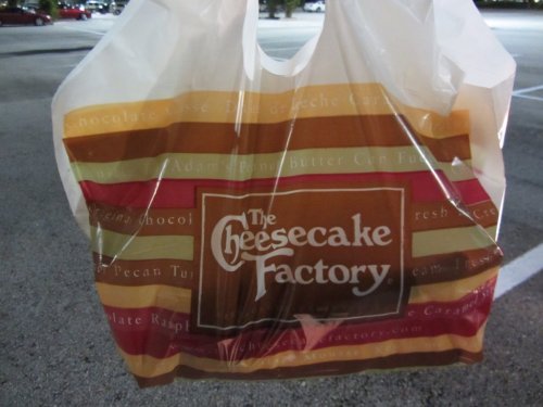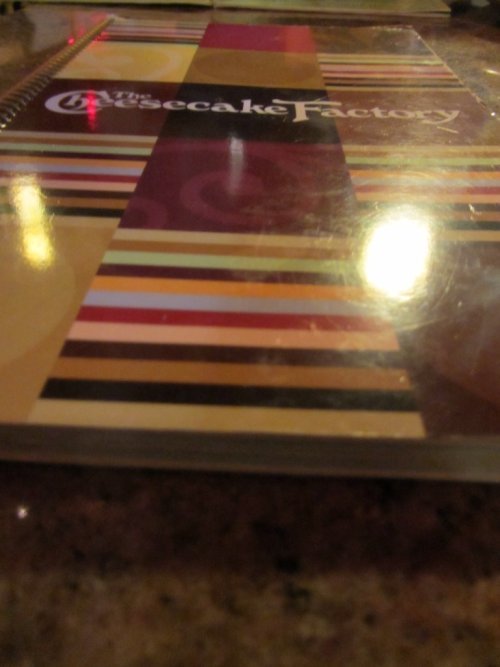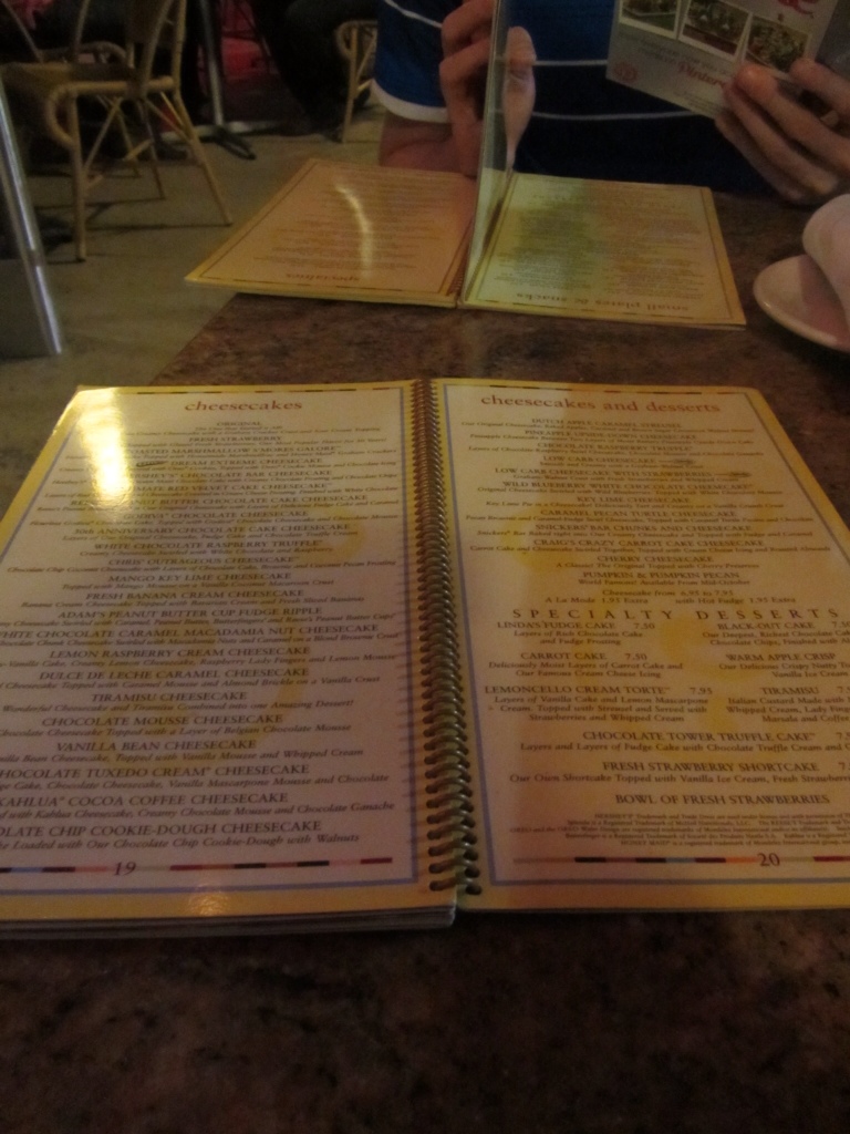 Es ist früher Abend und wir machen uns auf zur Cheesecake Factory – zweiter Versuch sozusagen. Und wir sind erfolgreich! Obwohl uns die Karte vom Umfang her etwas überfordert (Bild 1, man beachte, wie dick die Karte ist) und es alleine zwei Seiten voll mit den unterschiedlichsten Käsekuchenkreationen gibt (siehe Bild 2), schaffen wir es etwas zu bestellen.