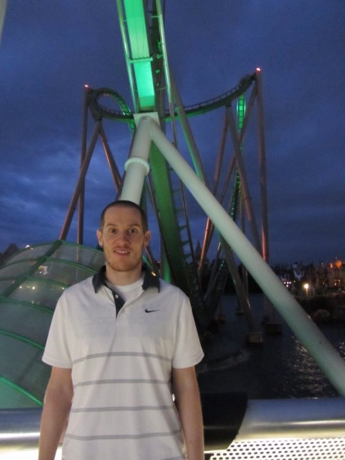 Zum Abschluss des Tages haben wir dann noch eine Runde mit dem Hulk-Coaster im Finstern gedreht, was wir immer schon mal machen wollten. Front row, versteht sich.