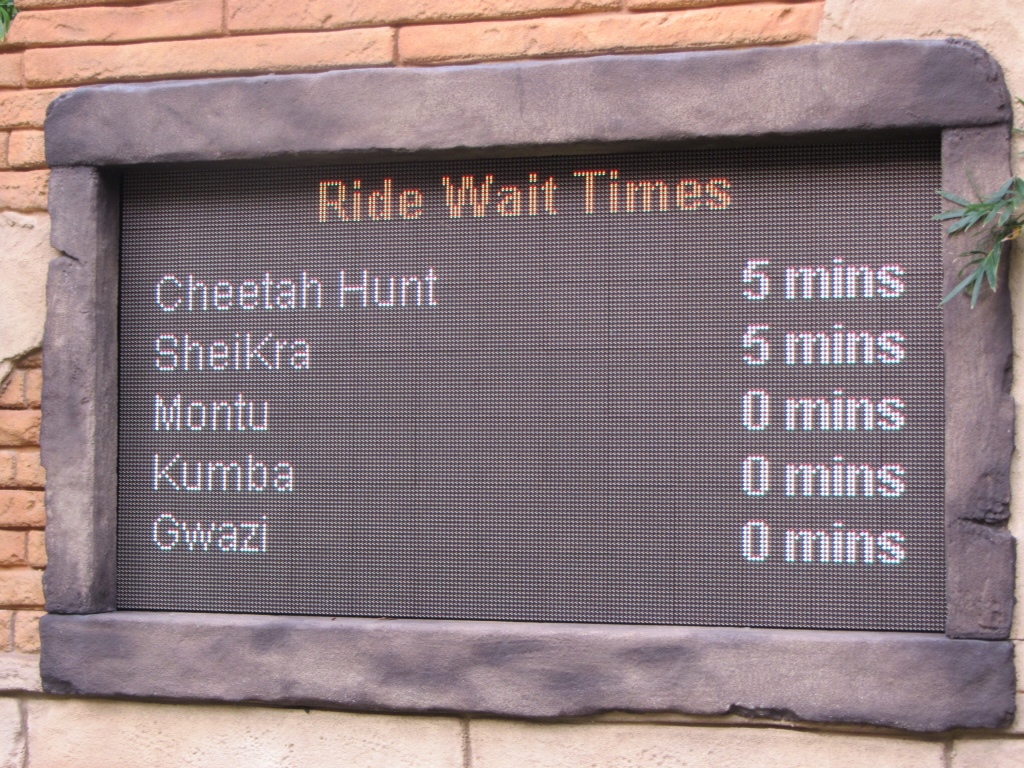 Wir starten mit einer der Signature-Achterbahnen, Cheetah Hunt. Dieser Coaster gefällt uns so gut, dass wir uns gleich zwei Mal hintereinander front-row-mäßig auf die Jagd machen. Die Wartezeit beträgt nicht einmal fünf Minuten. So etwas haben wir bisher noch nicht erlebt. Bei den anderen Bahnen dauert es heute auch nicht länger. Ein perfekter Tag für einen Freizeitpark, heute wieder mit dem dazu passenden Wetter.
