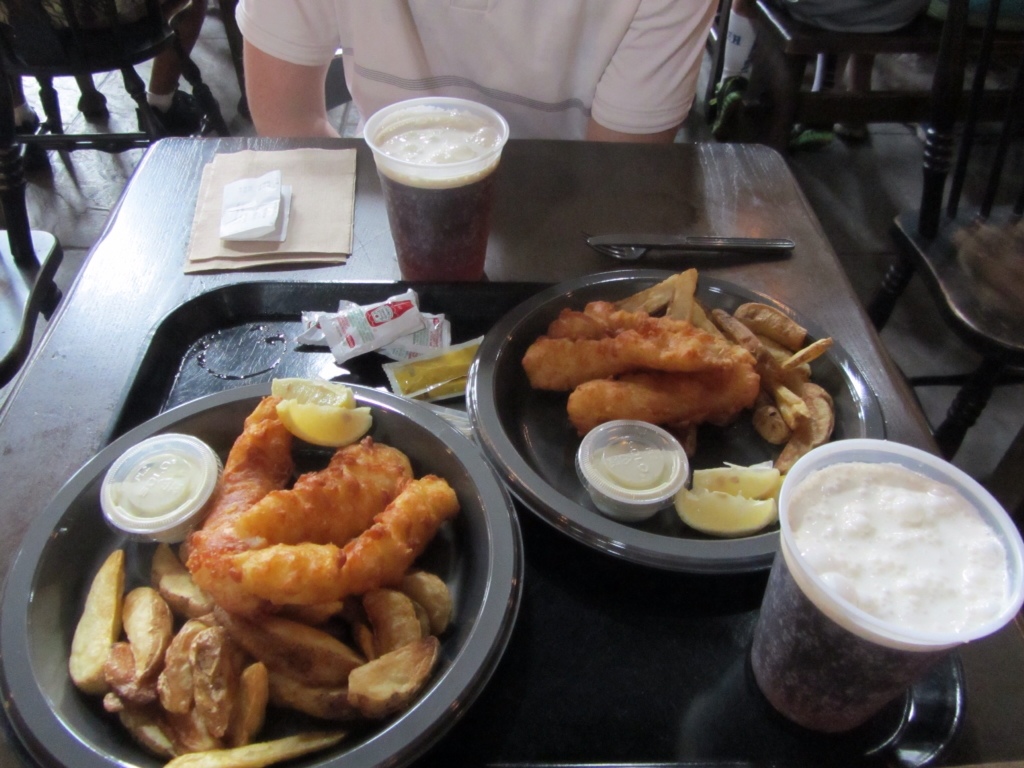 Meine Geburtstagsgeschenke für den Tag sind noch nicht aus und der Chris lädt mich auf ein Mittagessen inkl. Butterbeer ins Three Broomsticks ein. Zu Essen gabs übrigens Fish and Chips. Das Butterbeer schaut besser aus, als es uns schmeckt. Aber wenn man schon mal da ist muss man da durch