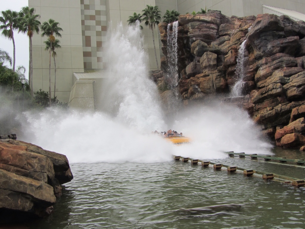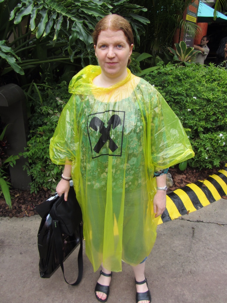 Mein Regencape, gesponsert von Raiffeisen, hat – zumindest MIR – mehr oder weniger nur als Attrappe gedient. Wenn man nämlich ganz außen sitzt, gö Chris, und vor einem zufällig auch keiner sitzt, gö Chris, verlässt man die Tour als gebadete Maus, Regenschutz (der eigentlich eh voll uncool ist) hin oder her. Falls ich es heute nicht schon erwähnt hab, diese Attraktion fahr ich MEIN GANZES LEBEN NICHT MEHR!!! Das River Adventure steht somit auf meiner Liste, von Rides, die ich NIE WIEDER FAHREN WERDE auf Platz zwei, gleich hinter dem Tower of Terror, der ungeschlagenen Nummer eins.