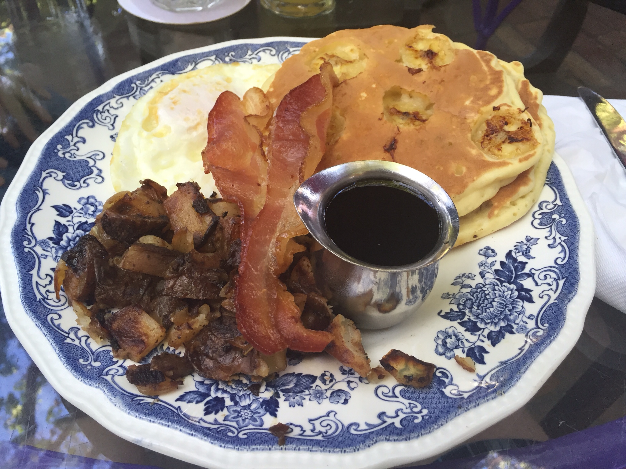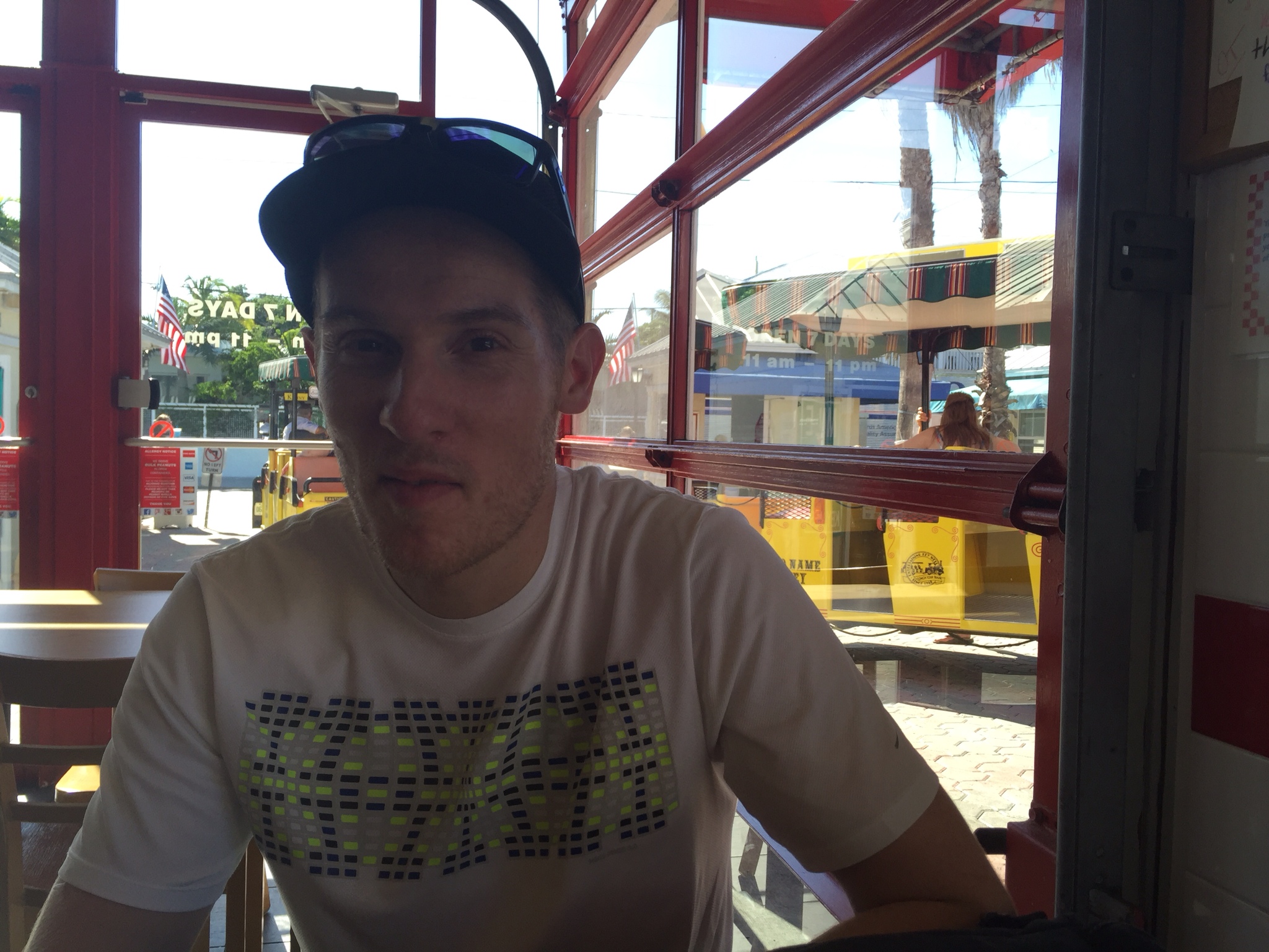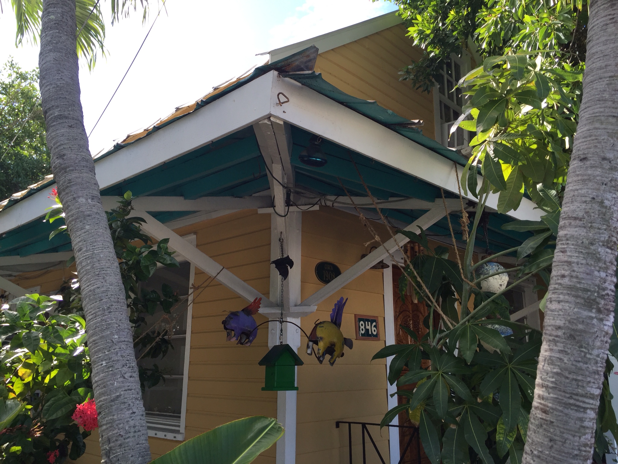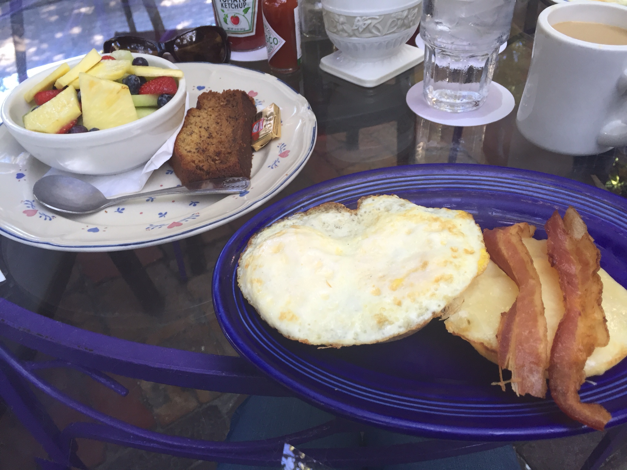 Wobei wir schon beim Thema wären. Unser “einmoooliges” Frühstück im Blue Heaven, das Rooster Special für den Chris und ein Breakfast Sandwich mit Obstsalat und Bananabread für mich (dabei mag ich nicht mal Bananen, aber hier schmeckt es einfach himmlisch und da Chris behauptet sogar, es wären gar keine Bananen drin gewesen – was soll's die Wahrheit liegt sicher irgendwo dazwischen). Als uns der Kellner fragt, ob wir Orangensaft, Kaffee oder eine Bloddy Mary haben möchten, sind wir die einzigen weit und breit, die beim antialkoholischen Getränk bleiben. Sourrounding im Key West Style eben.