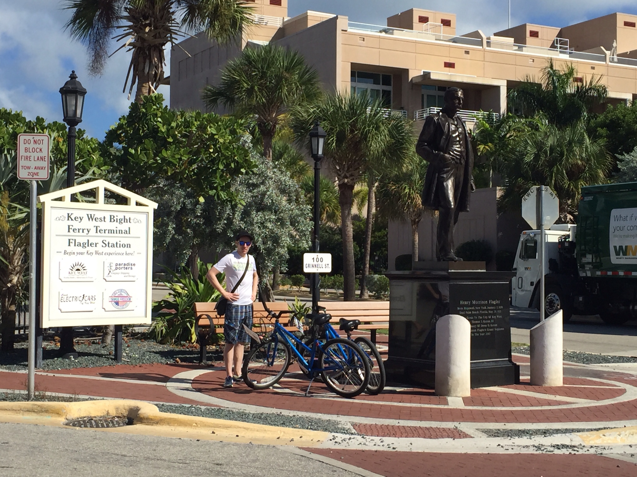 Was stellen wir heute an? Wieder richtig, Geocaching. Dieses mal mit erhöhtem Funfaktor per Bike (tolle Idee, Chris). Der Fahrtwind hat mir bei der Hitze, glaube ich, das Leben gerettet. Hier ein kleiner Geocaching-Schnappschuss mit unseren Rädern. Die Statue zeigt übrigens den Herrn Mateschitz von Key West, Herrn Flagler, Gönner und Bauer der mittleweile nicht mehr vorhandenen Eisenbahn (1912 bis 1935) bis zu den Keys. Ja, ja Geocachen bildet wirklich.