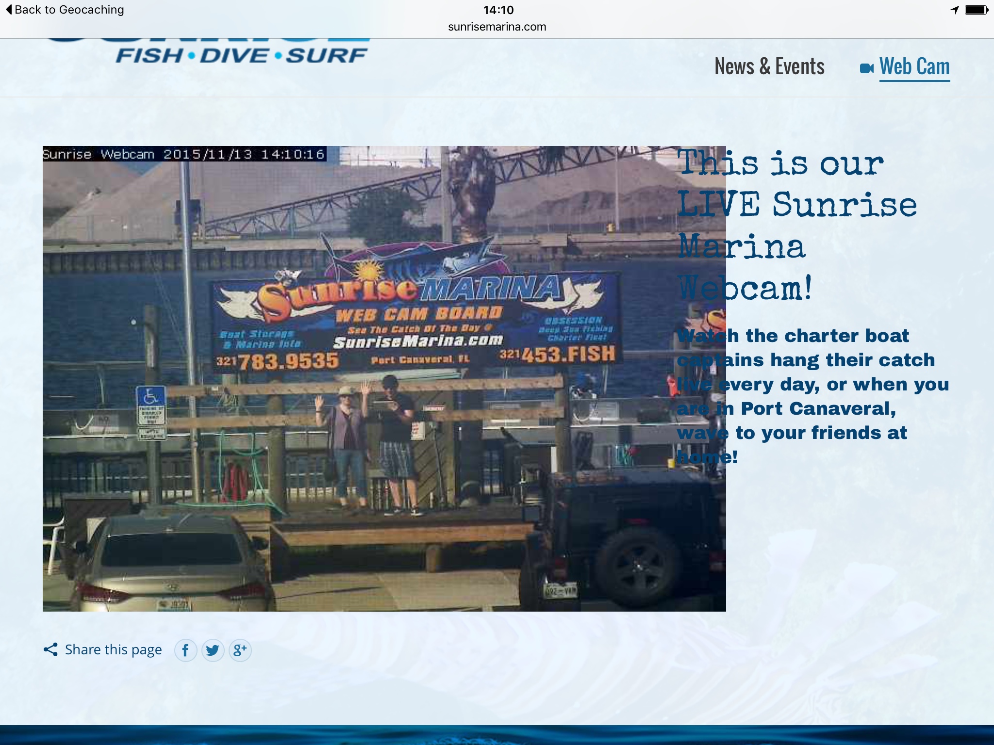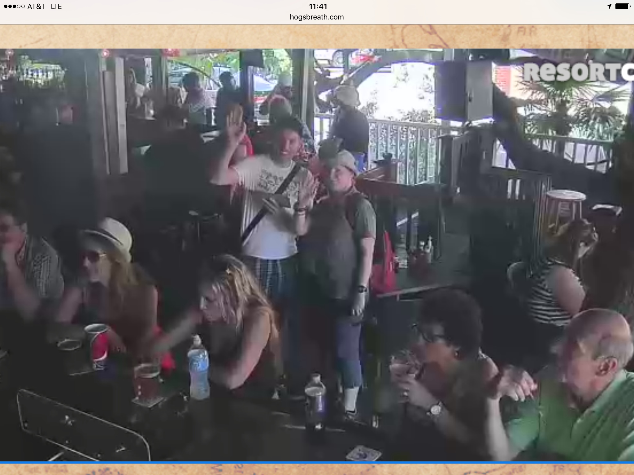 Hier unsere Tageshighlights. Dem Chris sein Lieblingscache heute war “Cache your Breathe” (man beachte das Wortspiel). Ein Cache, bei dem man eine Aktion schieben muss, damit man ihn loggen darf. Hier war der Auftrag, in den Hog's Breath Saloon zu gehen, die Webcam zu finden, zu winken, das ganze für die Nachwelt zu dokumentieren und den Schnappschuss dann an den Cache-Owner (also an den, der sich das alles einfallen hat lassen – vermutlich sponsered by the Hog's Breath Saloon) zu schicken. Das hat dann so ausgesehen und war ein irrsinniger Spaß und trotz der vielen Muggles sind wir anscheinend auch noch unentdeckt geblieben.