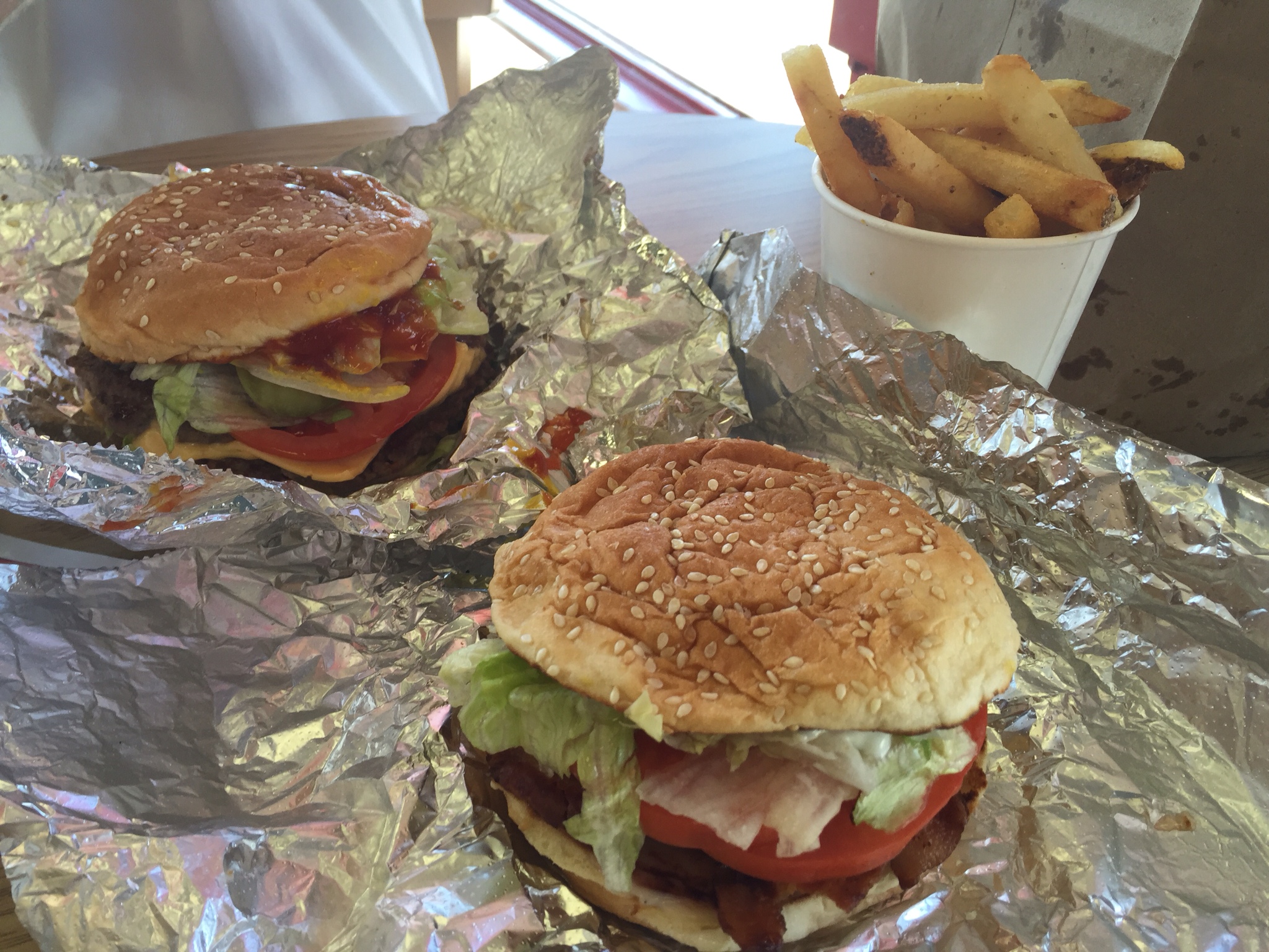 Viel haben wir erlebt und es ist erst Mittag. Zeit für einen kleinen Imbiss bei den Five Guys. Ein Duett aus Double Cheeseburger all the Way, no Mayo und BLT-Sandwich, “einmooolig”!