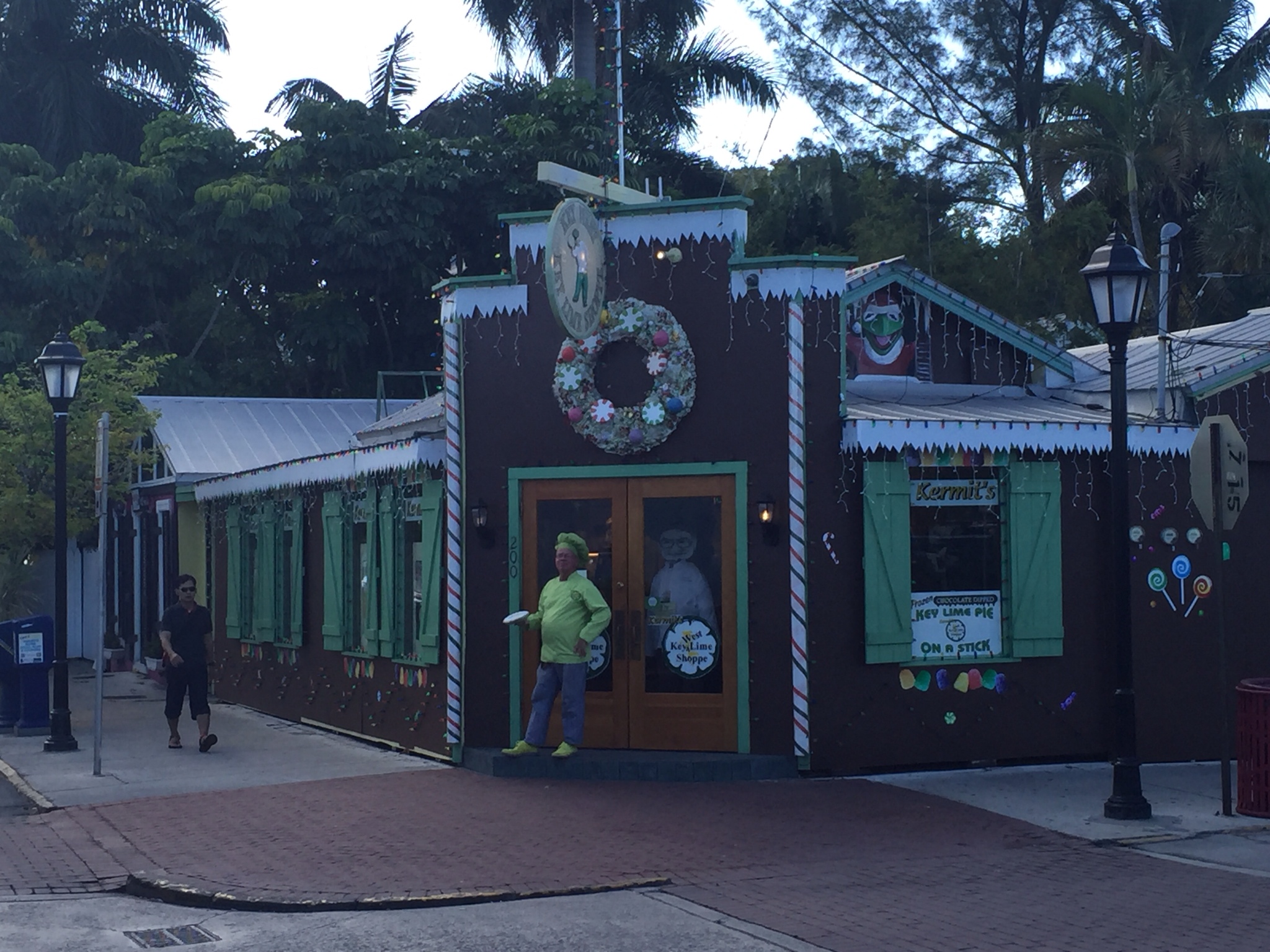 Parallel zu Jimmy Buffett’s Lebenserkundung starte ich meine eigene inoffizielle Key Lime Pie-Tour und erlebe Erfreuliches. Hier, Kermit himself, bei seinem Flagshipstore. Er begrüßt uns persönlich, öffnet uns die Tür und zieht dem Chris eine Key Lime Pie drüber. No kidding, aber die Torte war zum Glück unecht, wäre ja auch die volle Kuchenverschwendung gewesen.