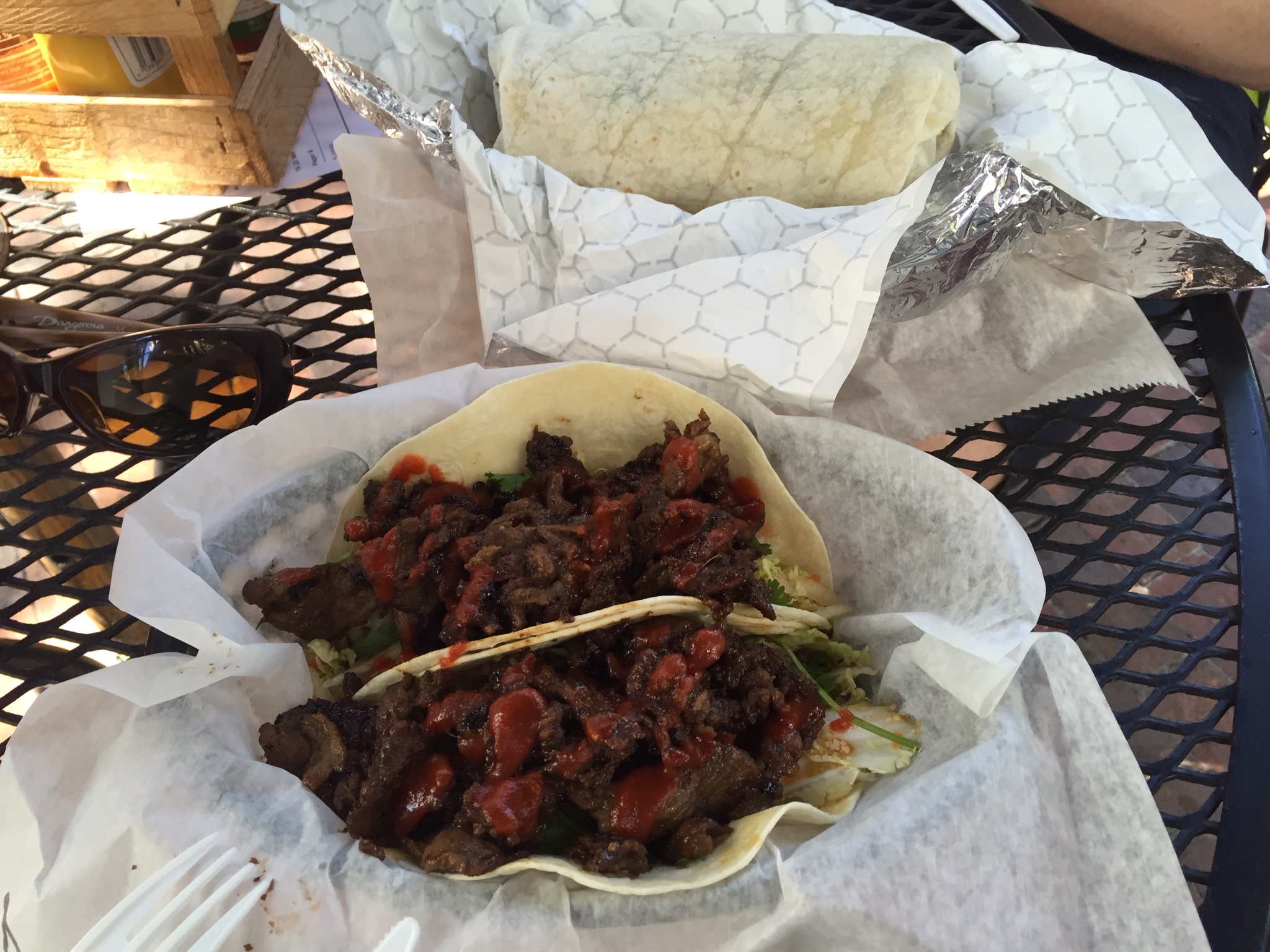 Ich habe die Kogi Tacos und der Mahi Mahi vom Chris versteckt sich noch im Burrito.