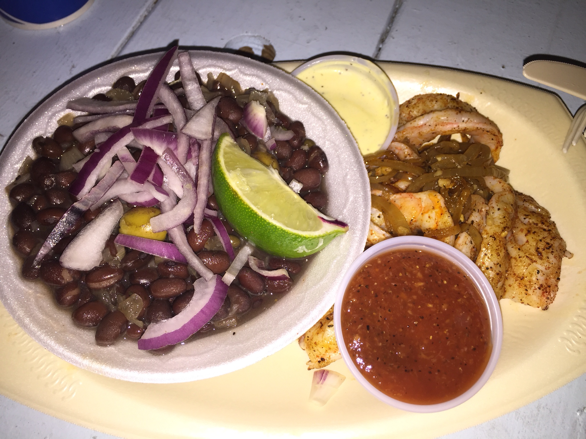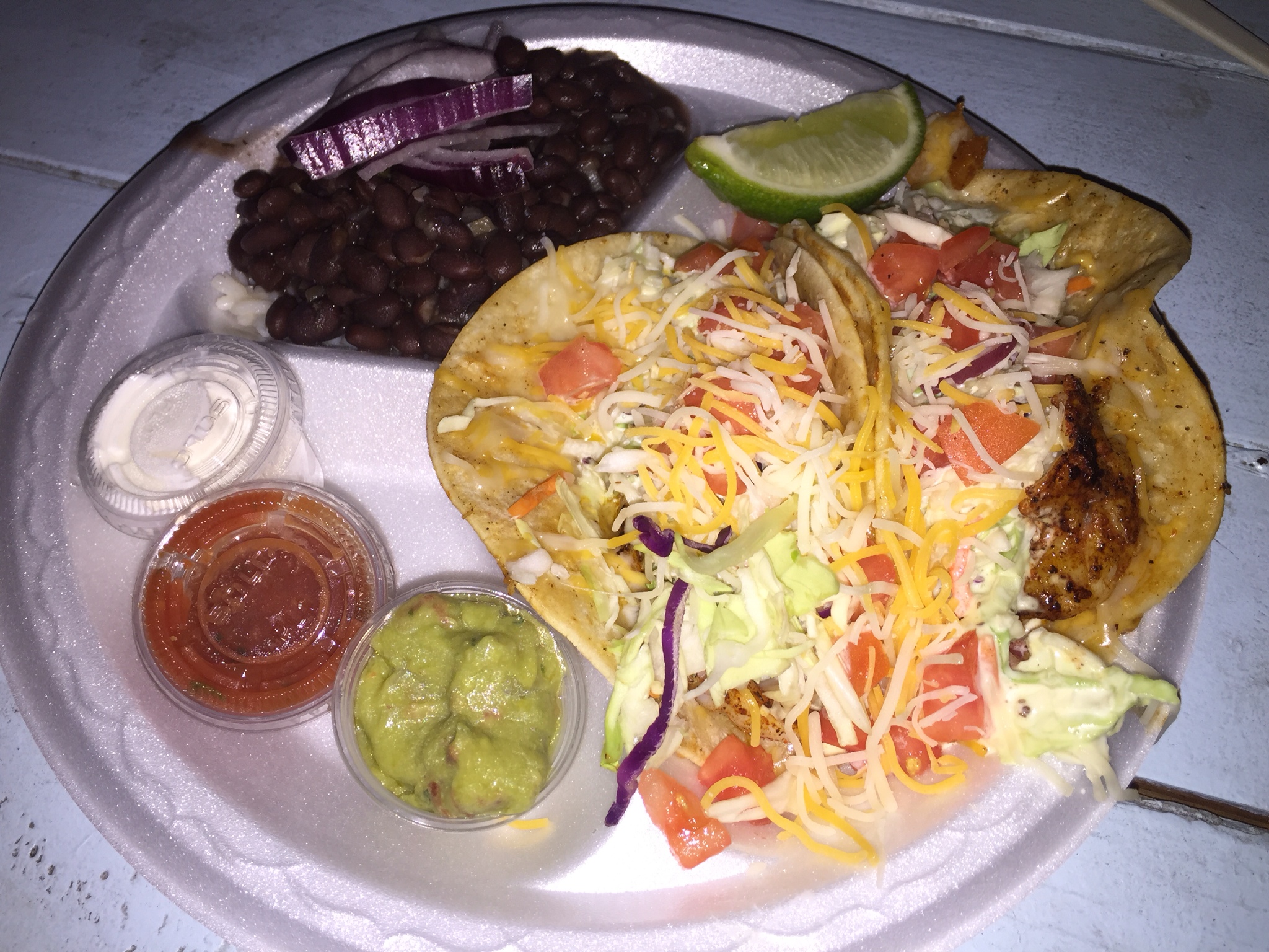 Hier beweisen wir fast den gleichen Geschmack. Ich habe Key West Pink Shrimp mit Bohnen und Reis gewählt, da Chris die Shrimp im Taco-Format. Sehr zu empfehlen!