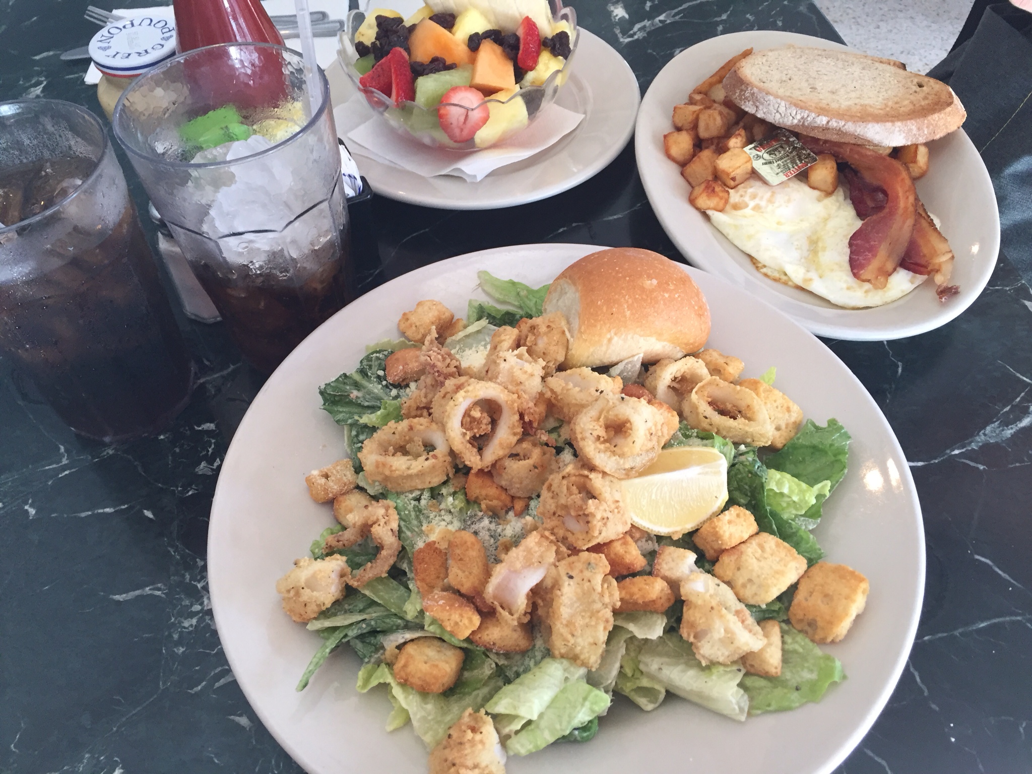 Daher geht es zurück nach Miami Beach und wir trösten uns im News Cafe mit folgendem Mittagessen: Breakfast Special für den Chris und einen Cesar Salad mit frittierten Kalamari für mich. Und der Cache-Fehlschlag, welcher Cache!?, ist vergessen.