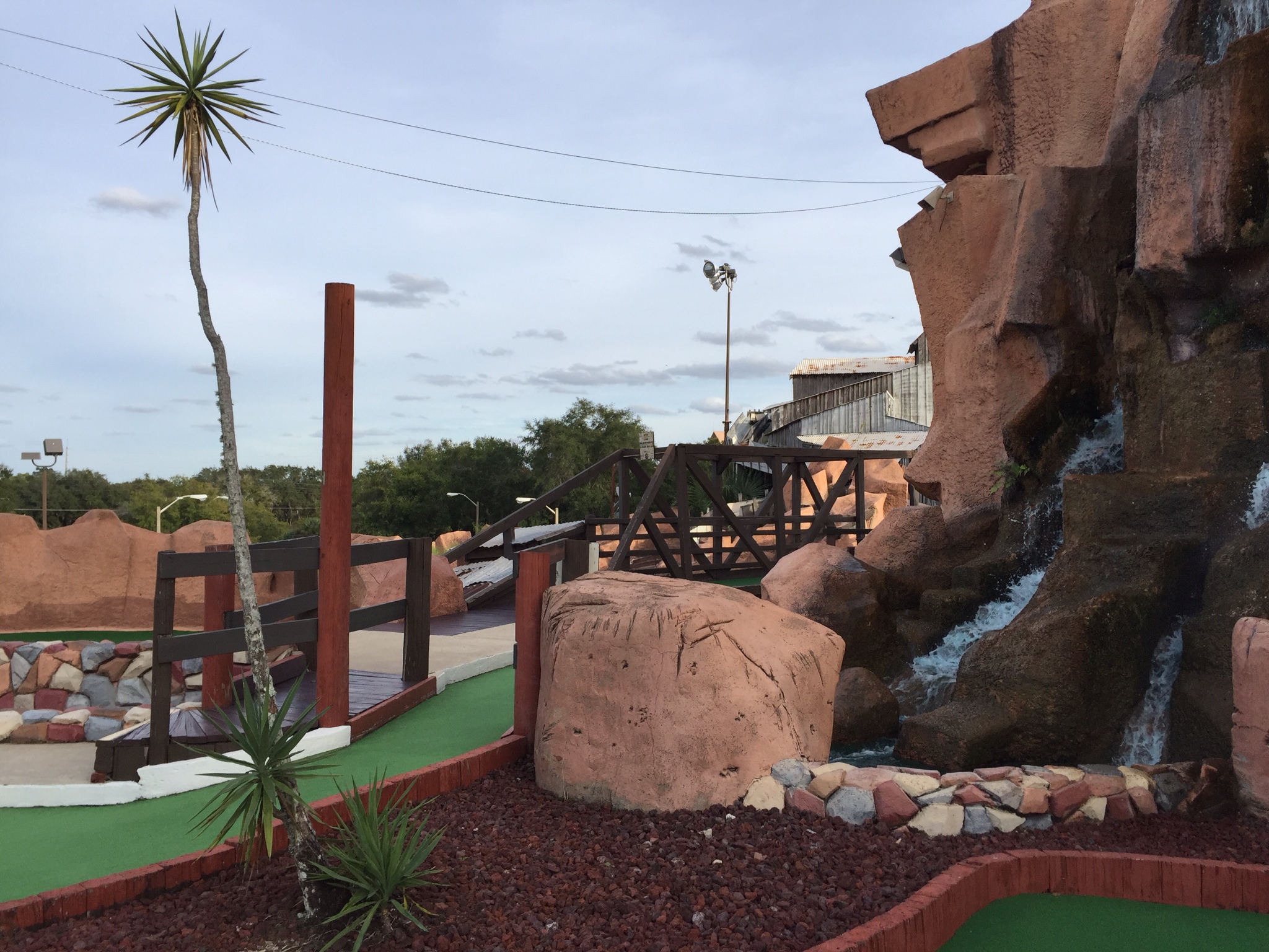 Da ich ab heute nur mehr auf baumfreien Mini-Golfplätzen spiele, findet das Revanche-Game auf dem Bonanza Golfkurs statt.